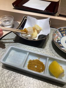 他の店では見たことがない天ぷらにつけるカレー塩が用意されており、食べてみると、 香り豊かなカレー塩が衣のサクサク感と素材の旨味に絶妙にマッチして、とても美味しかったです。